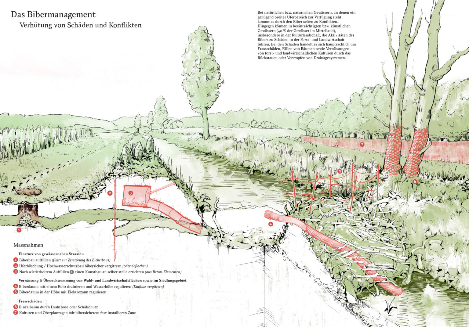 Nach umfassender Recherche war mein Ziel, die potenziellen Massnahmen zur Verhütung von Schäden und Konflikten mit dem Biber zu visualisieren, wie sie vom Bundesamt für Umwelt beschrieben werden. Genau genommen handelt es sich wohl eher um eine Fakten- als Datenvisualisierung. Dennoch habe ich mich darauf eingelassen, um den Rechercheaufwand möglichst gering zu halten.